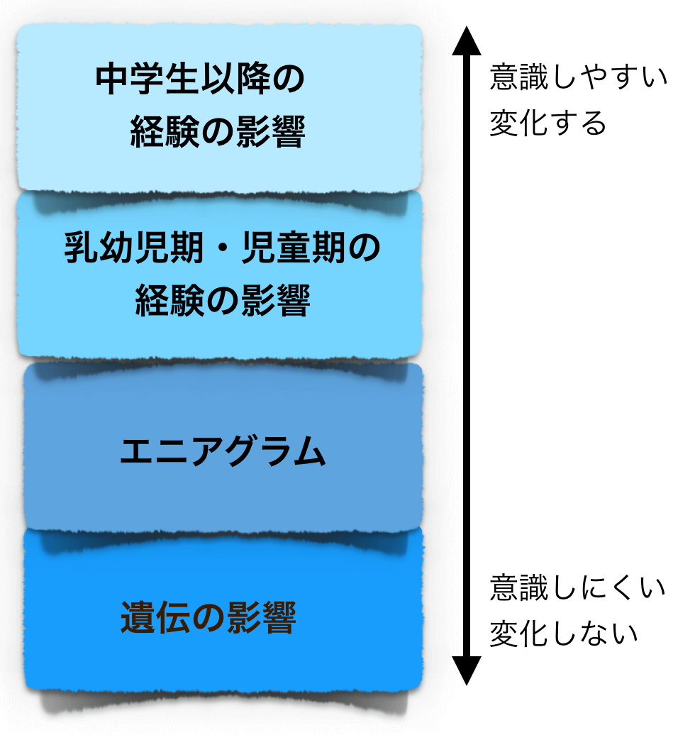 最も意識の深い部分にあり、意識しにくいのが遺伝の影響です。その次に深い層にあるのがエニアグラムタイプで、この2つは一生変わることはありません。
